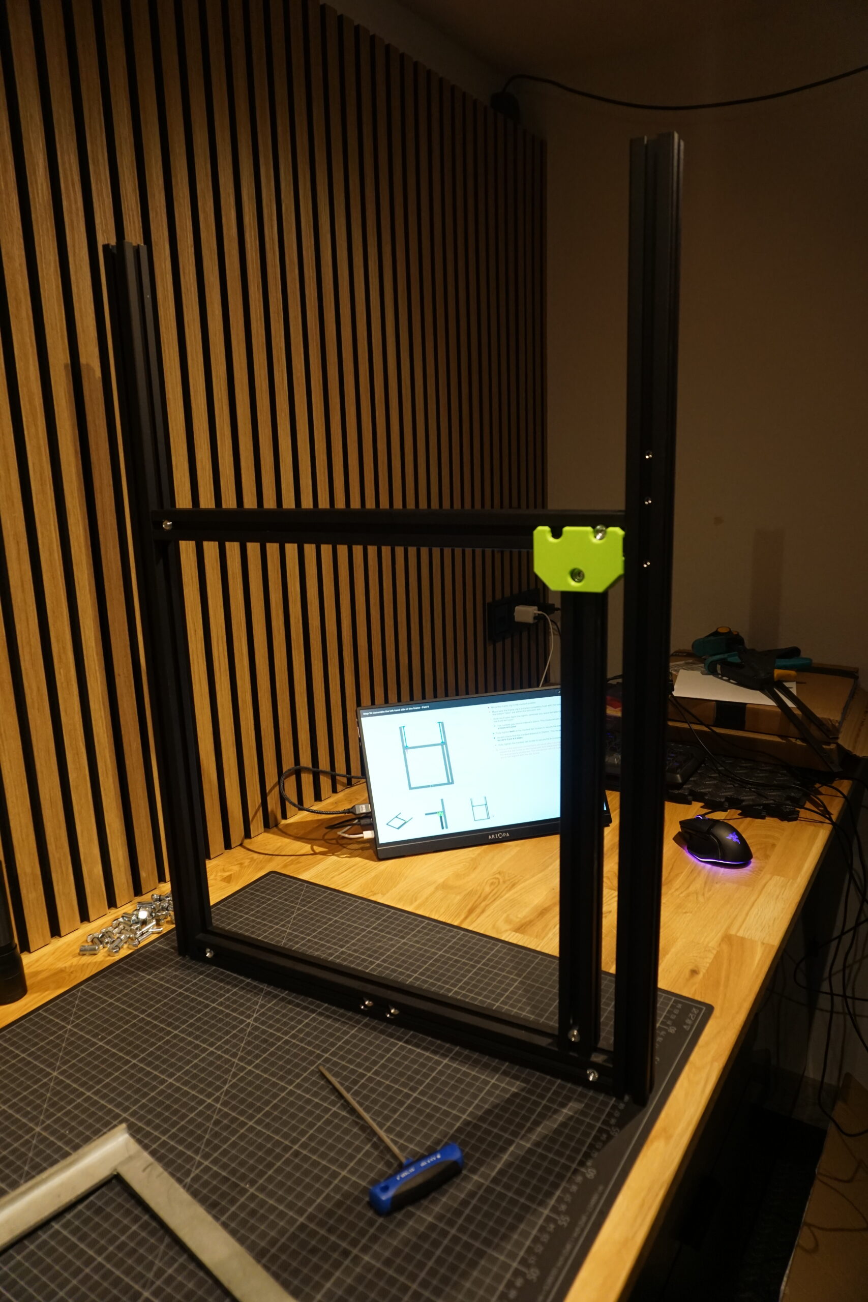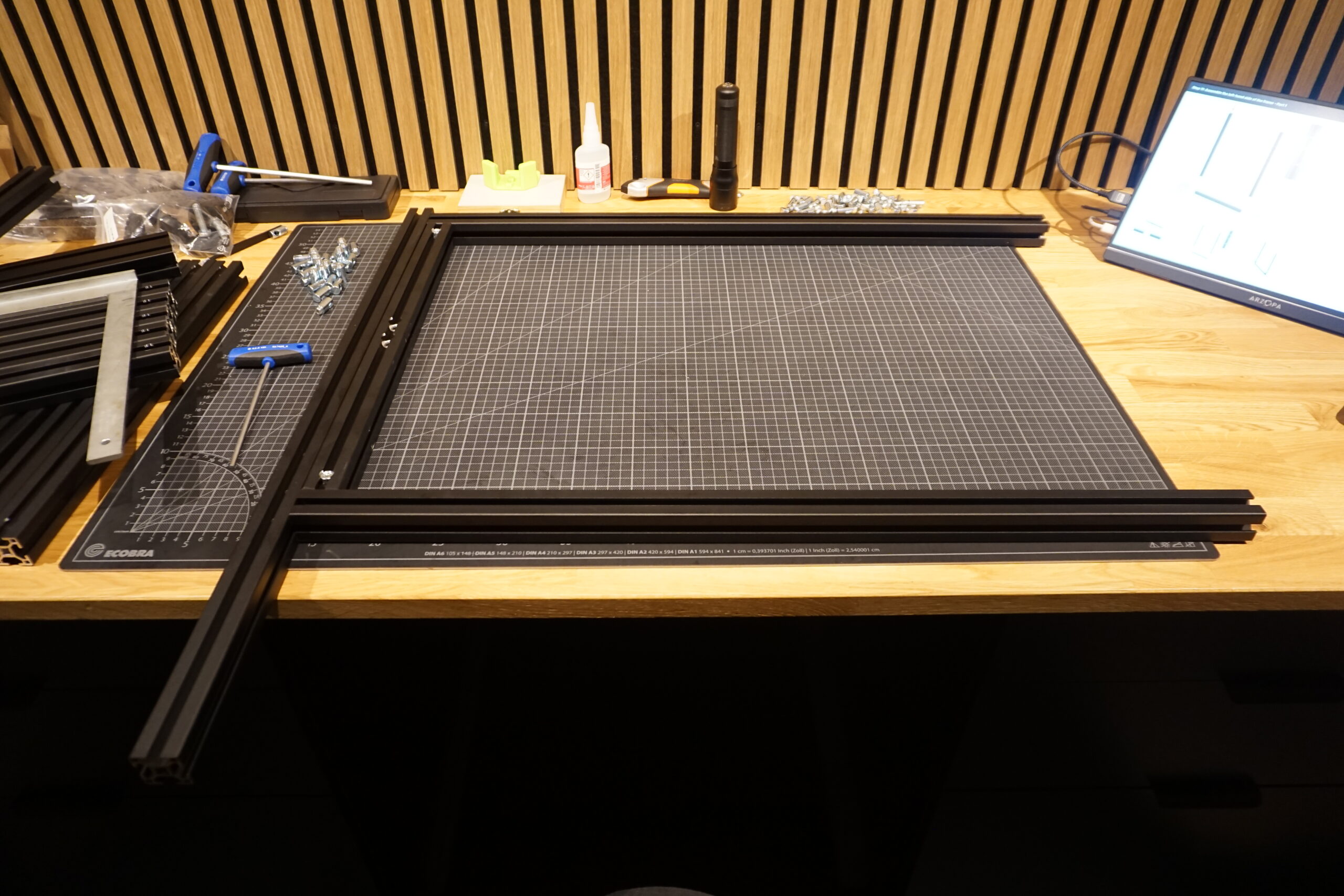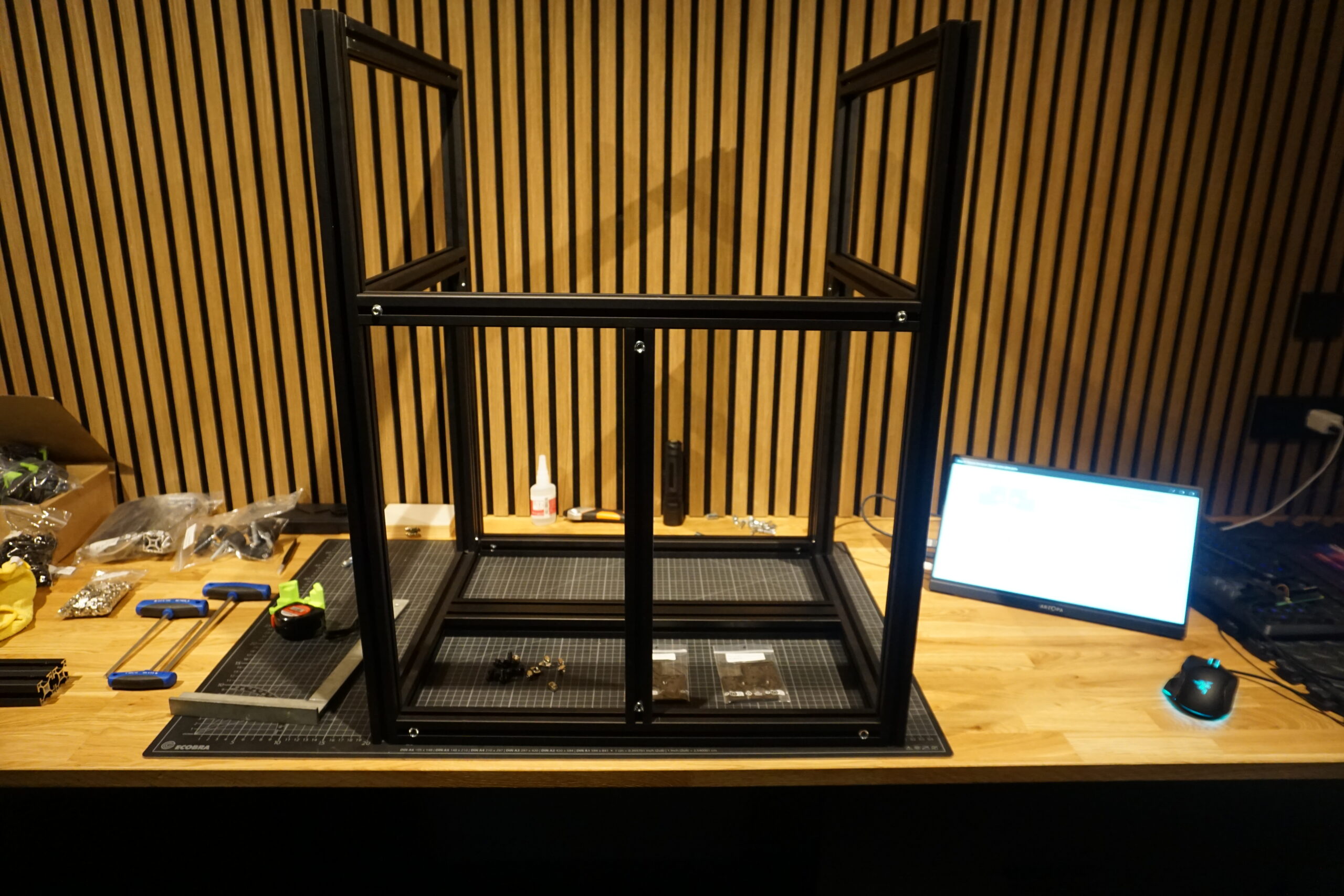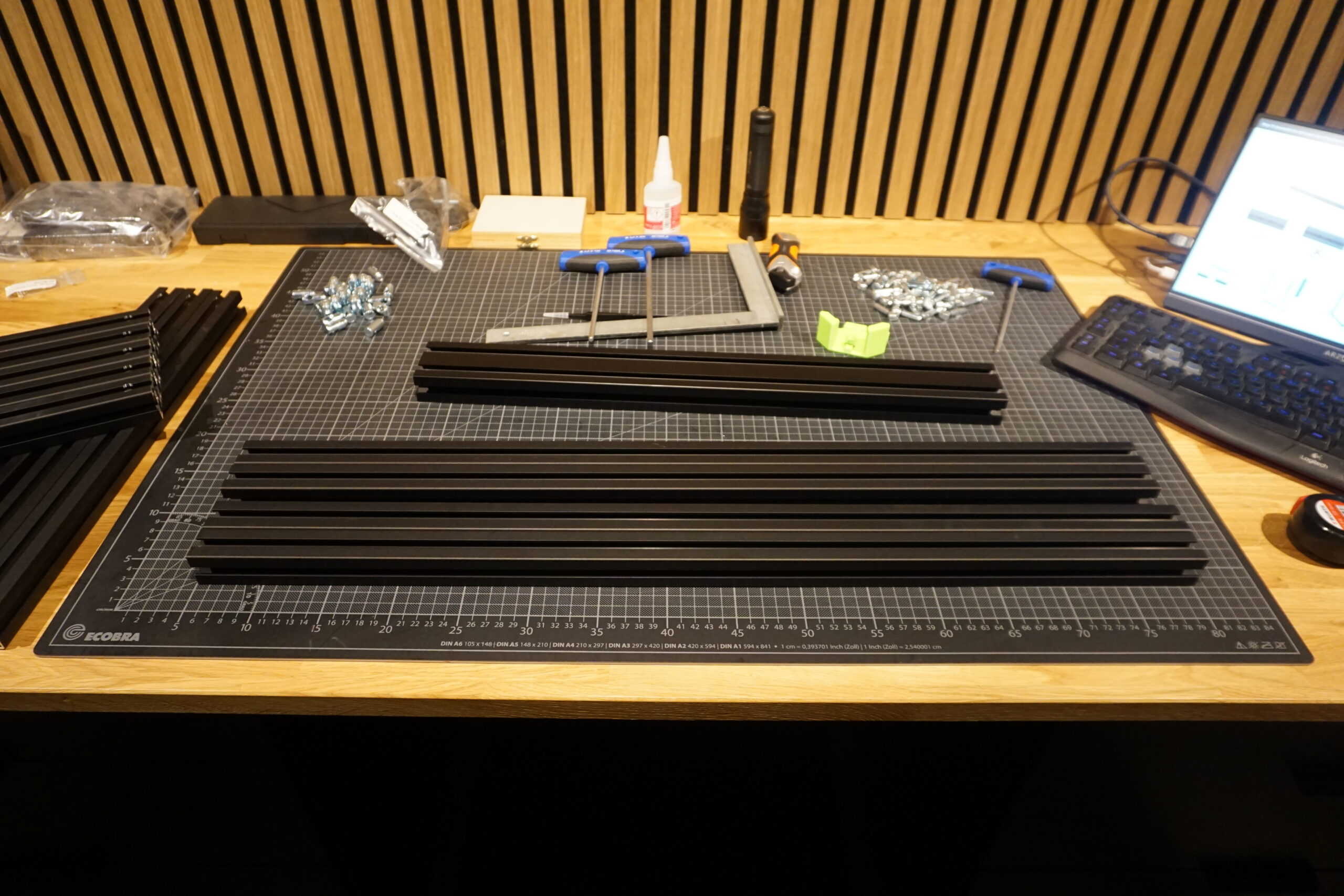erstmal alles sortieren – Schrauben, Profile, Elektronik, Druckteile, Kabel.